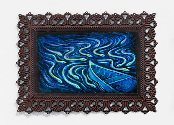 The third artist in A Boat Made of Dreams is Axel Wilhite, whose imagery comes directly from his dreams. He wakes in the night to record them—notes, sketches, flashes of color, and shapes—and later transforms these fragments into visual reflections that capture both the story and the mood of the dream. Wilhite approaches his dreams with sincerity and insight, believing that these nocturnal visions hold truths about the psyche that waking logic cannot express. In addition to his studio work, Wilhite is the publisher of the online arts publication 7x7.LA and was curator and co-director of the now-defunct Space Ten Gallery in Hawthorne, California.
